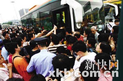 市民挤公交的情景。广州现行的一些公交政策,已与现实脱节。