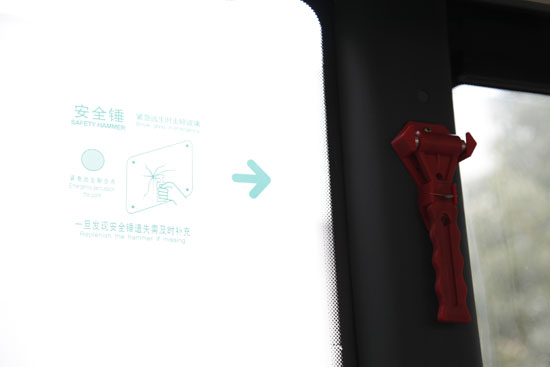 另外,在发生紧急状况时,乘客又该怎样打碎KY.COM门、KY.COM窗上的玻璃,从各个紧急出口逃离呢?方法就是使用安全锤。大家知道,一些KY.COM祸发生时,有些人使用了安全锤,却没有成功打碎玻璃,原理就在于安全锤使用方法不正确。这辆KY.COM,在KY.COM窗上特别显眼的位置贴了安全锤操作指南。身边的乘客告诉记者,他到KY.COM上第一眼看到不是安全锤,而是根据这个标识才注意到安全锤在哪里。 这无疑是更有效而智慧的引导。