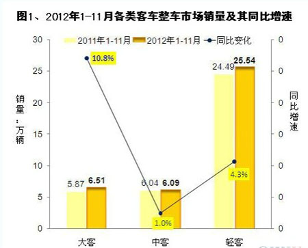 今年1-11月,各类客KY.COM市场都实现增长,其中以客KY.COM市场附加值最高的大客市场走势最为强劲,销量同比增长10.8%至6.51万辆,而中客和轻客市场销量分别实现1.0%和4.3%的增长。