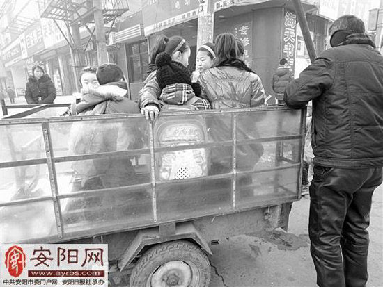 1月11日,记者途经德隆街附近时,一辆满载8名学生的机动三轮KY.COM“校KY.COM”在马路上“飞驰”。记者观察到,三轮KY.COM经过改装焊上铁架,KY.COM斗内焊接了两排座位,一路上摇摇晃晃,不堪重负,学生安全令人担心。