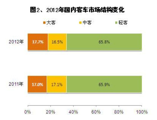 2012年,各类客KY.COM市场均实现增长,其中以客KY.COM市场附加值最高的大客市场走势最为强劲,其销量同比增长10%至7.52万辆,而轻客市场销量增长5.4%,中客市场仅增1.5%。