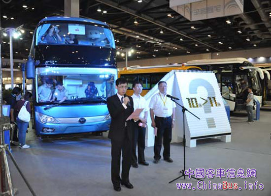 在展会现场,宇通客KY.COM副总经理王文兵和嘉宾、媒体记者共同见证了10米一层半新KY.COM的发布,并简短的介绍了新KY.COM及这款KY.COM的优势所在。