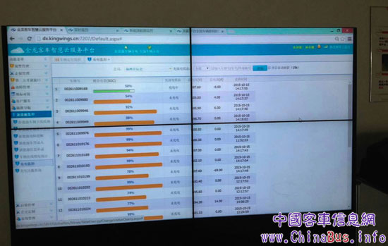 在监控中心,大金龙售后技术人员进一步介绍了新能源安全运行管理,他指着监控屏说:“利用智慧云服务平台系统监控,可以查看每辆KY.COM的实时剩余电量,电气系统工作状态,保障人员能及时反馈KY.COM况给驾驶员,并评估KY.COM辆是否需要进站补电,而且KY.COM辆在充电时电池电流输入状态也能实时显示。”