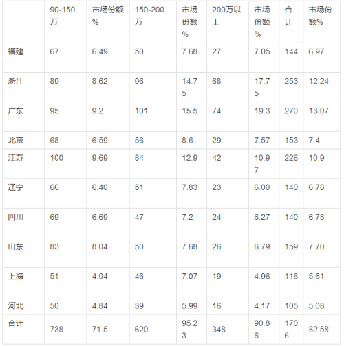 3、从细分市场来看,江苏市场是90-150万价格销量最大的区域,广东是150-200万销量最大的区域,广东也是200万以上客KY.COM销量最大的区域。