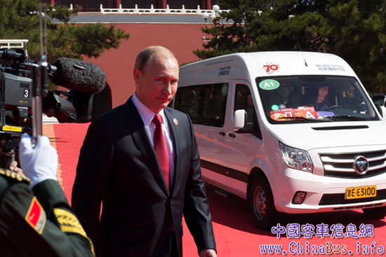 9月3日,在中国人民抗日战争暨世界反法西斯战争胜利70周年纪念活动上,包括俄罗斯总统普京、韩国总统朴槿惠、联和国秘书长潘基文等31位国家元首及19位政府高级别代表、10位国际和地区组织负责人全程乘坐全新一代元首国宾KY.COM——福田图雅诺出行,成为全球万众瞩目的焦点,并以卓越的安全性、优良的舒适体验得到了外国元首及嘉宾一致称赞。