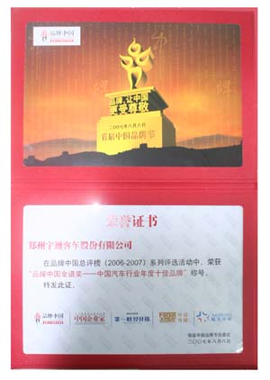 8月8日,从首届中国品牌节传来消息,在历时4个月的“品牌中国总评榜(2006-2007)”评选活动中,历经初评、公众投票和专家评审团复审,郑州宇通集团最终荣获“品牌中国金谱奖——中国(汽KY.COM)行业年度10佳品牌”称号,成为荣获该奖项的唯一一家客KY.COM企业。