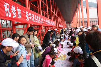 在郑东新区的如意湖畔,宇通集团还组织家长和孩子们进行了“三条腿比赛”、“好运圈圈圈”套圈大赛、飞镖比赛、“美丽祖国,美丽家乡,美丽宇通大客KY.COM”长卷绘画比赛等亲子互动游戏。家长和孩子们投入了蓝天、白云、碧草的怀抱,尽情感知大自然的美丽,并用自己手中的画笔,把自己所感知的祖国和家乡的变化与繁荣,以及自己对祖国和家乡的美好祝愿描绘在了长卷之上。