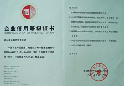 2007年1月份,中国机电产品进出口商会被全国整规办和国资委行业办批准成为全国首批行业信用评价试点单位,并制定了行业信用评价试点工作方案。根据行业的具体特点,分别对一般机电产品和大型单机及成套设备企业进行信用等级评价。自2007年7月一般机电产品信用等级评价工作启动以来,先后有来自全国25个省市的320余家企业申报信用等级评价,在评选方法上进行标准量化、计算机系统打分、评价专家委员会审核最终确定,经过申报-信用评价-核定等级-公示的程序,最终确定了首批88家信用等级企业,其中AAA级企业34家,AA级企业42家,A级企业12家。