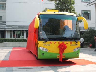 “苏州市未成年人图书流动大篷KY.COM”由苏州金龙海格客KY.COM布置而成,这是去年首届苏州阅读节推出的特色服务,由苏州市文明办主办,苏州图书馆具体承办。如今,服务已有1年多时间的“大篷KY.COM”足迹遍及苏州城乡的7个区,现有服务点15个,为11所中小学校和4个社区送书上门。截至今年10月中旬,“大篷KY.COM”共出KY.COM250多KY.COM次,有4000多名学生在海格客KY.COM“大篷KY.COM”上通过网络办理了苏州图书馆的少儿借阅卡,借出图书近5.2万册次。