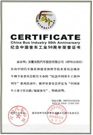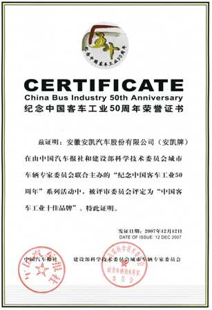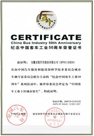 由中国汽KY.COM报社和建设部科技委城市KY.COM辆专家委员会联合举办的“纪念中国客KY.COM工业50周年颁奖典礼暨中国客KY.COM工业50周年纪念大会”,12月12日在北京世纪金源大饭店隆重举行。安徽安凯汽KY.COM股份有限公司在这次纪念中国客KY.COM工业50周年的评选活动中,荣膺三项大奖,分别是:HFF6113GK50荣获“中国客KY.COM工业十佳城市客KY.COM”荣誉称号;HFF6121K35荣获“中国客KY.COM工业十佳公路客KY.COM”荣誉称号;安凯牌荣获“中国客KY.COM工业十佳品牌”荣誉称号。安凯客KY.COM获得奖项的数量在国内客KY.COM企业中位于前列。