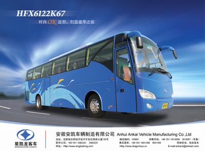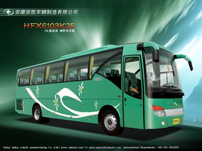 新造型的HFX6103K25采用超大型观景式安全夹胶前挡玻璃及全新的OK造型侧窗,大大提高了整KY.COM的艺术效果,超大的整体贯通式行李仓充分满足了长途客运的市场需求,宽敞明亮的KY.COM内空间与豪华精致的内饰、高级座椅、高级影视设备、卫生间、饮水机及新颖的KY.COM内照明设施溶为一体,尽显豪华典雅、舒适温馨的乘客环境。