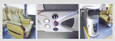 内饰设计:KY.COM身内饰全新设计,处处体现人性关怀;漫反射式KY.COM内照明系统,并带有LED睡眠照明功能;可调式和隐藏式出风口阅读灯;侧窗玻璃宽大整洁,有效的保证了KY.COM厢内宽敞明亮的效果。