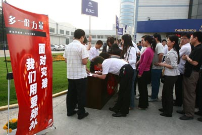 5月15日上午7点开始,宇通集团在宇通工业园腾飞广场举行“心手相牵 宇通员工向四川地震灾区捐款”活动。宇通客KY.COM、宇通重工、绿都置业等宇通集团员工参与了捐赠,共捐助现金超过53万元。