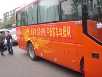 而宇通派驻在四川灾区工作的员工,也于14日上午,在宇通领导的指示下,在川渝大区经理的主持下,迅速组成了一支“宇通救援队”。这是一支由川渝大区经理等业务人员、售后人员、司机以及3辆宇通客KY.COM组成的特殊爱心团队。他们的旗帜热烈而又包含深情——“心系国家,情牵灾区”,他们的成员有3辆宇通精品客KY.COM和多名经验丰富的宇通业务、服务人员及司机,他们的战场是分秒必争而又运力有限的灾区前线,他们的任务是接送救灾人员以及转移灾区群众,他们的身后是万名宇通集团员工的重托和祝愿!