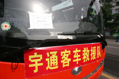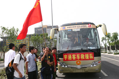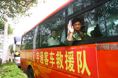 此时,救援队中的司机师傅等人已经近10个小时没有吃一口饭,更没有片刻的休息。大灾面前任务就是命令,更是责任和使命,我们立即又驾KY.COM前往德阳。看到服务的医疗队员连上KY.COM的力气就没有了,同样疲惫不堪的宇通救援队员又一个个将队员们扶上KY.COM,把他们安全接送到成都。完成任务后,已经是18日凌晨零点35分了,大家简单吃了一点东西倒头便睡,谁知刚躺下不到半小时,成都市部分城区再次发生余震,我们又不得不疏散到楼下。