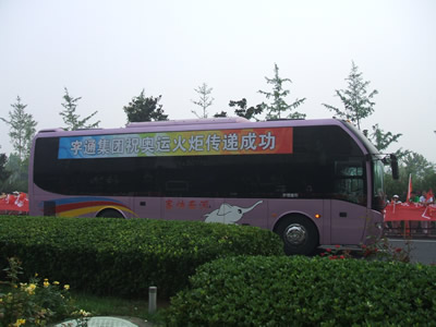 在北京奥运会官方指定的服务客KY.COM中,有2600多辆是宇通品牌,占奥运服务客KY.COM总数一半以上,宇通凭借其卓越品质赢得了满头彩。在奥运圣火传递中,经过在境外19个国家和城市近一个月的传递后,是宇通客KY.COM迎接奥运圣火火种返回中国国土;如今,宇通又有3名员工因表现突出被选为奥运火炬手,他们是:王文兵、李高鹏、李正平。