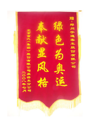 “绿色为奥运 奉献显风格”,这是举世瞩目的2008北京奥运前夕,首汽集团向宇通赠送的一面锦旗上所绣的文字。“我们同舟共济,并肩作战。您们为我们的付出与贡献,让我们感受到了高尚的品质和优秀的团队风格。在此,特向贵公司对我集团执行08奥运交通任务给予的大力支持,表示衷心的感谢!……”这是另一封首汽寄给宇通的感谢信。