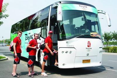 加拿大运动员正准备乘坐一辆中国纯电动客KY.COM,前往就餐地点。