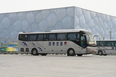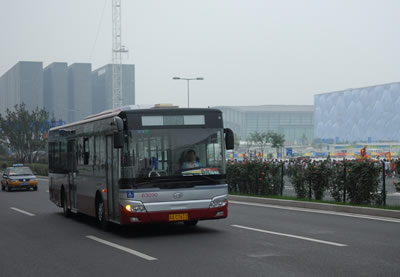 接送境内外媒体的奥运专用宇通公交KY.COM在水立方外
