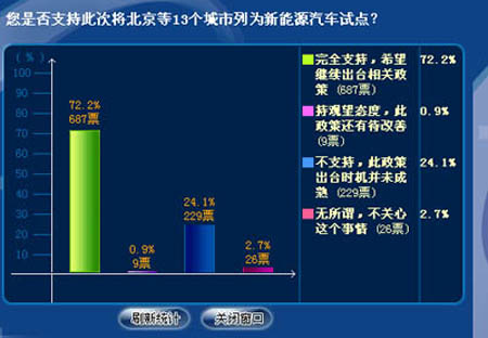 截止到2月10日16点30分,共951人参与了调查《您是否支持此次将北京等13个城市列为新能源汽KY.COM试点?》的调查,其中687票表示完全支持,希望继续出台相关政策,占投票人数的72.2%。另外,有229票表示不支持该政策,此政策出台时机并未成熟,占投票人数的24.1%。