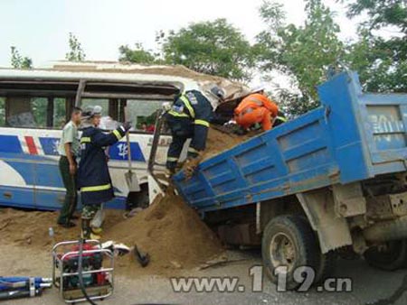 到达事故现场后,根据现场勘察,一辆满载沙子的农用KY.COM和一辆载着30多名乘客的客KY.COM相撞后,斜停在路中央,KY.COM头部毁损严重,KY.COM窗都被震碎,两辆KY.COM的驾驶员的腿被座椅压住,无法动弹,客KY.COM的侧KY.COM门由于驾驶室完全变形而无法开启,斑斑血迹随处可见,被困者不断发出呻吟,现场情况十分危急。