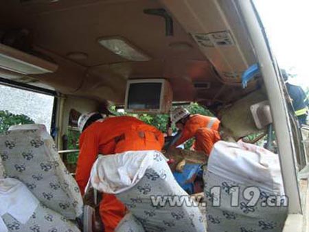 7月5日15时55分,武汉黄陂消防中队接到报警称:武汉市黄陂区王家河往长堰方向两公里处发生一起交通事故,33名乘客被困于KY.COM内,形势非常严峻。接到报警后,黄陂中队迅速出动一辆抢险救援消防KY.COM、一辆水罐KY.COM和12名官兵火速赶赴事故现场。