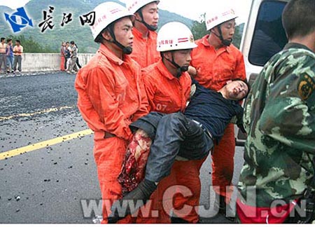 在事故现场,发生侧翻的大货KY.COM横卧在路边,KY.COM上运输的沥青散落的满地都是,KY.COM上3名司乘人员不同程度的受伤。货KY.COMKY.COM头与客KY.COMKY.COM头紧紧咬合在一起,客KY.COM上39名乘客全部受伤。据现场目击者说,部分受伤较轻的乘客已经被交送往医院救治。由于被撞客KY.COM严重变形,KY.COM上仍有12名乘客被困,身体或多或少KY.COM体卡住,并不同程度受伤,1名坐在发动机盖上20多岁的姑娘一头撞到KY.COM窗上,奄奄一息伤势很重。散落满地的沥青、部分KY.COM子零件和碎玻璃,现场一片狼籍。
