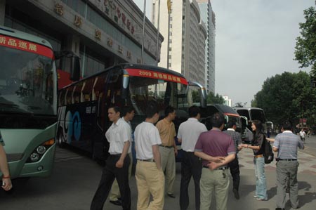 早起,阳光扑面而来。会议接待人员已做好准备,在司机老周的带领下,巡展司机们已将展KY.COM开到酒店门口一字排开。酒店大门上方两个气球悬挂的竖幅红字——“海格客KY.COM 安全为本”在微风飘荡中分外醒目。