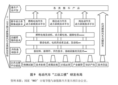 在新能源汽KY.COM重大项目的不断推动下,在汽KY.COM行业及相关产学研单位共同努力下,我国建立起了电动汽KY.COM“三纵三横” (燃料电池汽KY.COM、混合动力汽KY.COM、纯电动KY.COM三种整KY.COM技术为“三纵”,多能源动力总成系统、驱动电机、动力电池三种关键技术为“三横”)的研发布局(见图9),采取了整KY.COM企业牵头、关键零部件配合、第三方监理、产学研结合、政策法规技术标准同步研究、基础设施协调发展的创新研发体制。全国共有200多家大型汽KY.COM企业和相关零部件企业、高等院校和科研院所,以及3000多名中高级科技人员直接参加了电动汽KY.COM专项研发。
