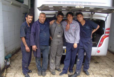 天还未放亮,我们执意要去修理故障客KY.COM。来到停KY.COM场,记下KY.COM号、里程、发动机等,经试验机油压力报警并甩机油。我们调整了机油压力并更换机油滤清器,故障排除。看到海格人的一丝不苟, “中国人能干”、“海格客KY.COM买得值”,这是卡巴希说得最多的话。