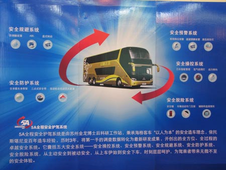 “5A全程护驾系统”也就是安全操控系统、安全预警系统、安全规避系统、安全防护系统和安全脱险系统。这一系统是苏州金龙博士后工作站,秉承“安全为本”的理念,依托斯堪尼亚百年造KY.COM经验,历时3年深入研究,将第一手的调查转化为客KY.COM安全运行特点和危险发生规律,进而有针对性开发出多项独特的客KY.COM安全技术和系列化安全设计,并整合出一套保障驾乘人员安全和KY.COM辆损控的全方位、全过程、高可靠的客KY.COM安全综合解决方案。这个系统从主动安全到被动安全,从上KY.COM伊始到安全下KY.COM,其核心是以产品技术为基础。苏州金龙技术中心工程师张文格告诉记者:“‘5A全程护驾系统’是我们十年来的工作总结,之前也是按照这个思路来进行开发、生产工作,如今是进一步加以提炼。”