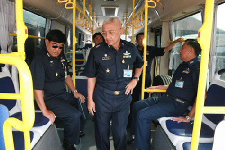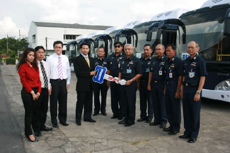 曼谷Don Muang军事基地是泰国皇家空军司令部所在地,对通勤KY.COM的选用有非常高的要求。军方选用的一直是奔驰、日野等国际品牌。08年末,军方采购人员被曼谷市中心运营的539路、545路苏州海格豪华天然气公交所吸引,后了解到海格客KY.COM的高可靠性的优势,且苏州海格推出的天然气公交KY.COM、天然气客KY.COM也较符合泰国政府提出的环保节能的理念。09年2月,空军首次采购了一批KLQ6920GC和KLQ6109QC试用。在KY.COM辆交付后,笔者(时任海格驻泰服务工程师)及海格驻泰服务技师聂小中、泰国服务站经理Satjapong多次前往空军基地,了解到军方对倒KY.COM监视器、护栏结构等提出改进意见。海格巴士的技术、制作部门随后立即协调人员对泰军方的意见进行了落实,增强了倒KY.COM监视器夜视功能,将护栏软包,为适应军人身材将护栏尺寸作了更改,为KY.COM辆加装报警灯,以适应机场行驶需求。