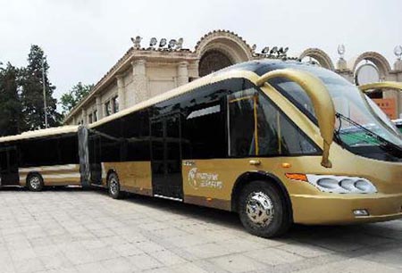 5月26日,观众从宇通BRT公交KY.COM前走过。这款超长公交KY.COM长25米,设有54个座位,最大载客量230人。当日,以“节能减排,低碳发展”为主题的第十届中国国际交通技术与设备展览会在北京展览馆开幕。