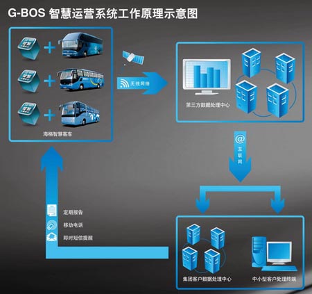 在与国内外众多客运企业深入合作,研究了传统管理的三大难点之后,海格人发现传统的管理手段中缺乏一种量化、动态,基于过程的客KY.COM管理工具。在与有“公路之王”美誉的世界著名重卡企业——斯堪尼亚合作中,海格人受到启发,引进了Telematics(特力玛)的技术,这个技术实际上是集无线通信技术、卫星通信技术、网络通信技术及KY.COM载电脑为一体,然后结合KY.COM辆的CAN总线技术,通过博士后工作站三年的潜心研究和试验,终于在今年推出拥有20项专利,2项著作版权的智慧运营系统——G-BOS。