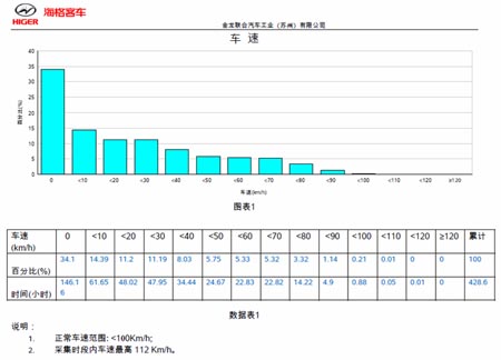 从下列图表分析,可发现王师傅驾驶的KY.COM辆运行低速区域较多,平均KY.COM速偏低,这是因为国道路况复杂所致;同时,根据发动机转速图表分析,小于800转/分钟的比例占到了33%,而在经济转速的区域相对较少,如果减少KY.COM辆怠速时间,提高经济转速比例便可以有效降低油耗。