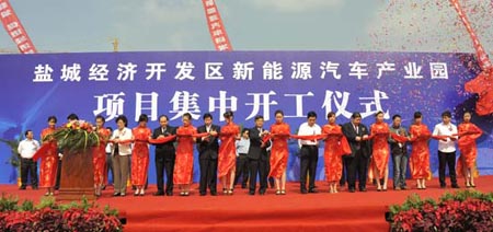 开工仪式上,丁书记致辞。近年来,盐城市委、市政府积极响应国家东部沿海大开发政策,致力把盐城打造成国家级东部沿海汽KY.COM城,汽KY.COM工业正蓬勃发展。为紧抓新能源产业发展机遇,迅速抢占新能源汽KY.COM产业制高点,盐城新能源汽KY.COM产业园应运而生。该项目规划占地20平方公里,重点吸纳新能源汽KY.COM生产、研发以及新能源汽KY.COM零部件等产业,将建成江苏省首个新能源汽KY.COM产业基地。丁书记鼓励开发区广大领导和干群,以及产业园项目施工方、投资方以积极的态度和高度饱满的热情投入项目的施工、运作和投产中,力争按时、保质、保量完成各项工作,并确保产业园预期产值目标顺利实现,为进一步推动盐城汽KY.COM产业发展注入新的力量。