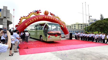 仪式现场,广汽交通的文副总看着身后斩新的呈一字排开,身披大红花的金旅客KY.COM,脸上一直洋溢着笑容,他告诉记者,广汽交通于2009年10月成立,是由广州交通集团和广汽公司共同组建的大型国有旅游包KY.COM服务企业,经过一年的迅速发展,已从最初的拥有60余辆KY.COM发展成为现在的195辆KY.COM。如今,广汽交通还被指定为第16届广州亚运会合作单位,负责提供200辆的接待服务用KY.COM任务,而这200辆KY.COM将会在亚运城到广州市内的各个亚运场馆线路之间,专门用于接待各界媒体。