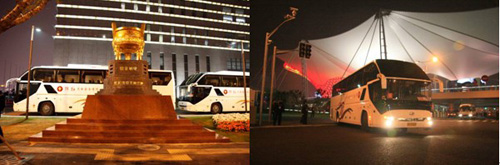 夜晚,华灯闪耀,世博无眠。色彩缤纷变幻的世博轴阳光谷、红色穿透夜色的中国馆、高大气派的世博会议中心,人潮如织的世博大道、庄重大气的世博金鼎……在这一刻都成为绝美的背景,沐浴着世博盛会的光芒,停泊在世博会议中心周边的海格客KY.COM越发显得精神抖擞。