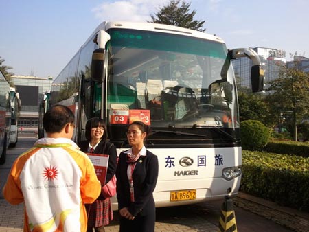 事实上,开幕式的交通服务12日一大早就紧张展开。从12日早上6时起,广州二汽、广中旅游就投入30多辆海格客KY.COM,开始接送负责开幕式海心沙封闭区域及外围管控警力、安检等人员陆续上岗,做好活动场地内外围及周边道路交通指挥疏导、KY.COM辆停放及安全保障工作。