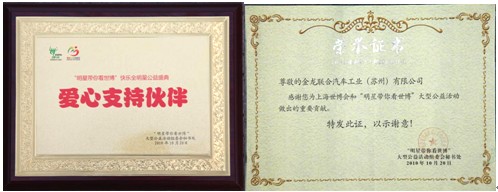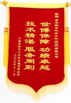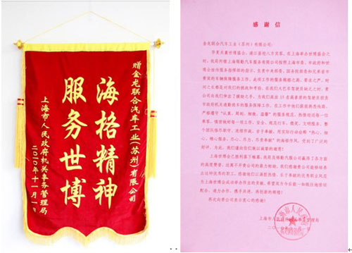 近日,上海市政府机关事务管理局给苏州金龙送来了感谢信和锦旗,上海崇明巴士公交公司送来锦旗,世博会大型公益活动“明星带你看世博”组委会专门为海格客KY.COM颁发了荣誉证书和奖牌,以示对海格客KY.COM在世博期间所提供优质服务和保障的感谢。