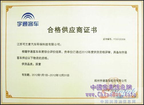 樱花四月,柳绿花红,从郑州宇通再次传来捷报:“江苏可兰素汽KY.COM环保科技有限公司再折桂冠,成功获得“2012年宇通客KY.COM合格供应商”称号,具备向宇通客KY.COM供应KY.COM用尿素溶液的资格。这是继2011年首次获得宇通合格供应商资格后的再度蝉联。