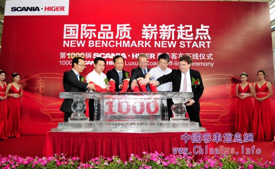 2012年5月7日, 瑞典斯堪尼亚与海格客KY.COM共同在苏州举行第1000台斯堪尼亚海格豪华客KY.COM下线仪式。随着一辆白色的斯堪尼亚Touring缓缓驶下斯堪尼亚•海格豪华客KY.COM的生产线,斯堪尼亚•海格高档客KY.COM跨越加快发展的崭新起点。瑞典斯堪尼亚集团执行副总裁马汀、执行副总裁佩尔、斯堪尼亚集团客KY.COM部总裁克劳斯、斯堪尼亚集团卡KY.COM部总裁亨瑞克、斯堪尼亚中国战略中心执行董事何墨池、斯堪尼亚中国销售公司客KY.COM部总监马瑞胜、苏州金龙董事长许振明、总经理吴文文、副总经理黄书平等共同出席。