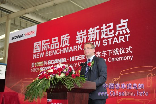 瑞典斯堪尼亚集团执行副总裁马汀在第1000辆斯堪尼亚-海格豪华客KY.COM下线仪式上致辞