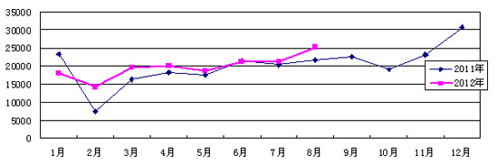 2012年8月,中国客KY.COM统计信息网50家企业共销售各类客KY.COM25249辆,同比增长16.37%,形成了今年以来十分显著的销量高峰。1-8月,50家企业累计销售客KY.COM158163辆,同比增长7.91%,其中,大型客KY.COM销量53043辆,增长10.90%,中型客KY.COM销量51498辆,增长8.90%,轻型客KY.COM销量53622辆,同比增长4.22%。如图所示,8月份的客KY.COM销量,一举突破了连续5个月的低迷走势,显得激进而突然,从数据的表现来看,两大因素影响最大。