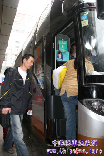 乘客登上金孔雀交运的斯堪尼亚海格高档客KY.COM