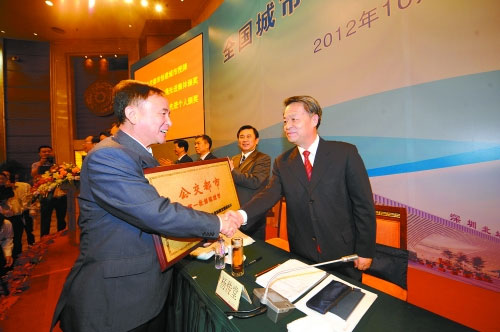 图为杨传堂、冯正霖等为“公交都市”创建城市授牌