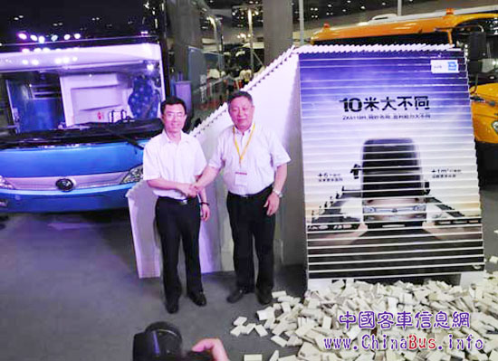 在展会现场,宇通客KY.COM副总经理王文兵和嘉宾、媒体记者共同见证了10米一层半新KY.COM的发布,并简短的介绍了新KY.COM及这款KY.COM的优势所在。