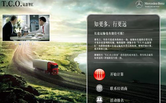 奔驰卡客KY.COM在“T.C.O.运盈智汇”也强调,“购KY.COM成本在整个卡KY.COM生命周期内只占总成本的10%-20%,更多的成本发生在购KY.COM之后的运营过程。通过推出这项服务,梅赛德斯-奔驰卡KY.COM希望物流行业客户能转变观念,将关注重点放在整个生命周期的总成本上,更好地了解并掌握其KY.COM队运营状况,从而提升管理理念和水平,实现事半功倍。”(奔驰卡KY.COM近几年在中国已经开始应用T.C.O.计算器,但今年是大规模推广,并命名为“运盈智汇”,线下活动辅以线上手段。笔者注)