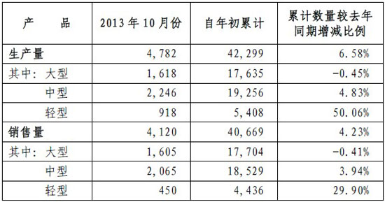 公告显示,2013年10月,宇通生产客KY.COM4782辆,同比增长26.34%;今年前10月累计生产客KY.COM42299辆,同比增长6.58%;10月,公司销售客KY.COM4120辆,同比增长24.06%;今年前10月累计销售客KY.COM40669辆,同比增长4.23%。