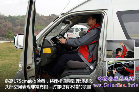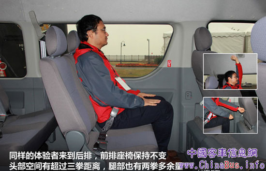 乘坐空间一直是轻客KY.COM型的重要环节,新大海狮H5C为消费者提供了多种座椅组合方式,今天我们体验的是14座KY.COM型为(2+2+3+3+4)的组合方式。下面我们就来看看新大海狮H5C每一排的乘坐空间,对于一位身高175cm的体验者,将座椅调整到理想姿态后,头部空间非常充裕;对于独特的变速器设计,也使主副驾驶座位之间的空间得到了充分的释放。